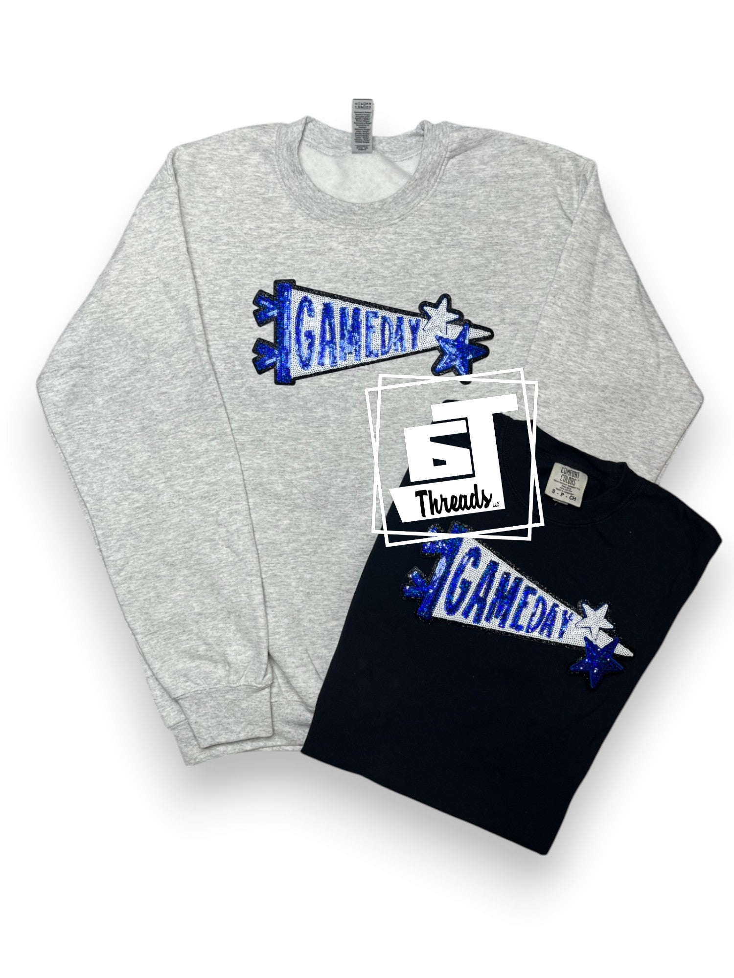 The Royal Blue Sequin Gameday Pennant showcases vibrant royal blue sequins meticulously arranged into a traditional pennant shape. This embellishment offers a striking, shimmering accent that enhances game day apparel or accessories with bold color and dynamic texture. Crafted for durability, it maintains lasting sparkle, providing fans with an elegant and spirited way to showcase their team pride.