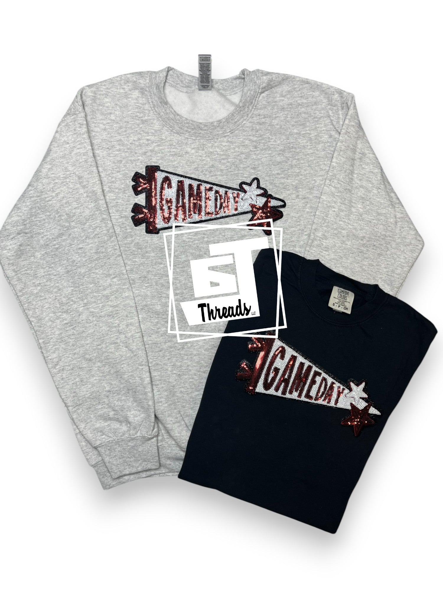 The Maroon Sequin Gameday Pennant features rich maroon sequins arranged in a classic pennant shape, perfect for elevating game day attire with a polished, spirited look. This embellishment adds vibrant color and sparkling texture to shirts or accessories, delivering both visual impact and durability. Designed to maintain its shine, it’s an excellent choice for fans seeking to combine style with lasting quality.