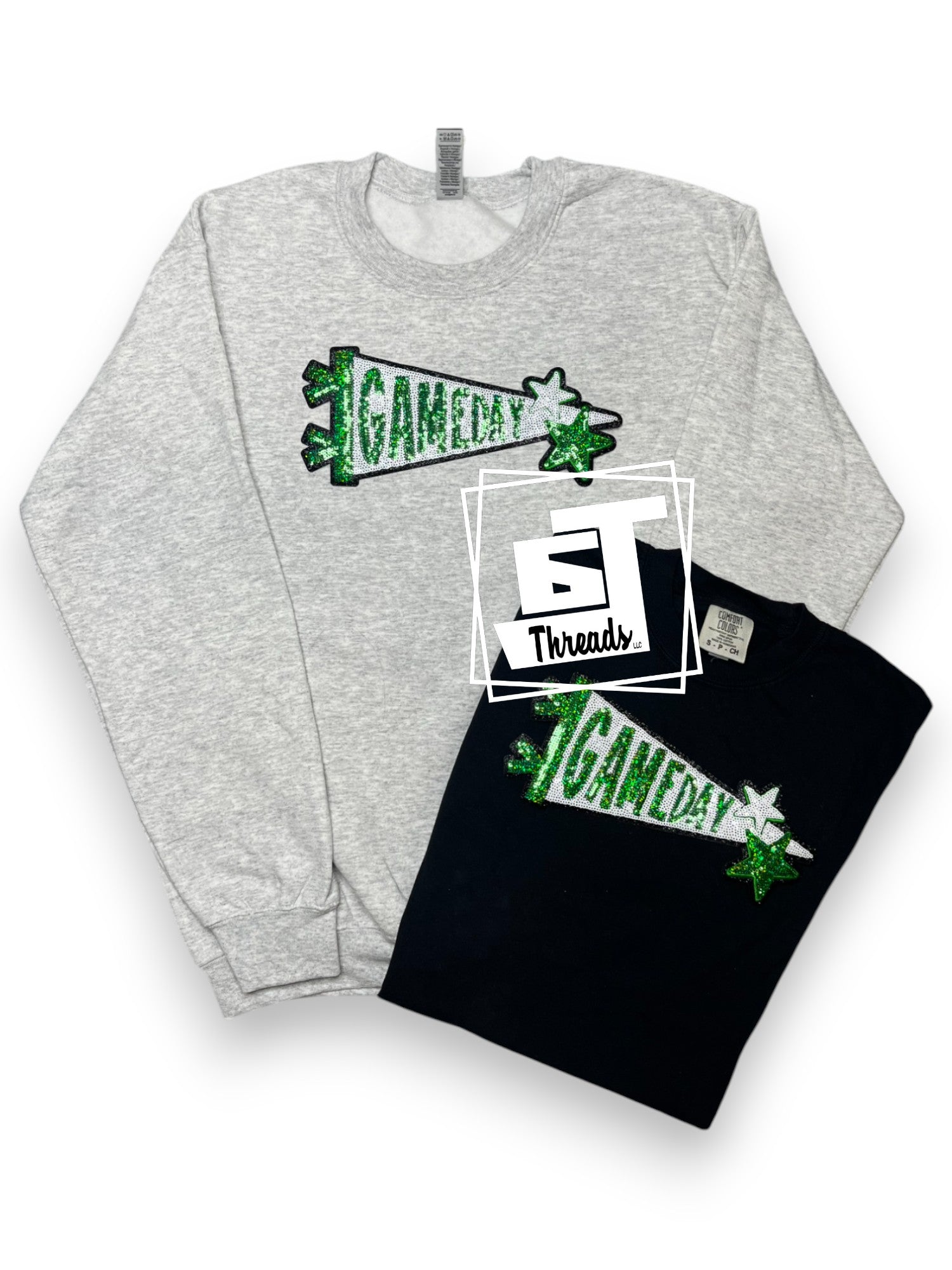 The Green Sequin Gameday Pennant features vibrant green sequins skillfully arranged in a classic pennant shape, perfect for adding spirited flair to your game day attire. This embellishment combines bold color with sparkling texture to enhance apparel or accessories. Built for durability, it ensures lasting shine and visual impact, making it an ideal choice for fans who value both style and quality.